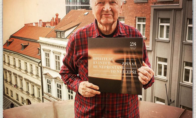 Jiří Tichota letos oslavil pětaosmdesát let. Poté, co jeho Spirituál kvintet odehrál loni na podzim poslední koncerty, má spoluzakladatel legendárního souboru čas i na svá muzikologická bádání a poslech hudby všeho druhu. A taky na třídění nahrávek Spirituál kvintetu. Milou připomínkou umění kapely je kompilace Zpívat se nepřestane – To nejlepší, která vyšla k Tichotovým narozeninám